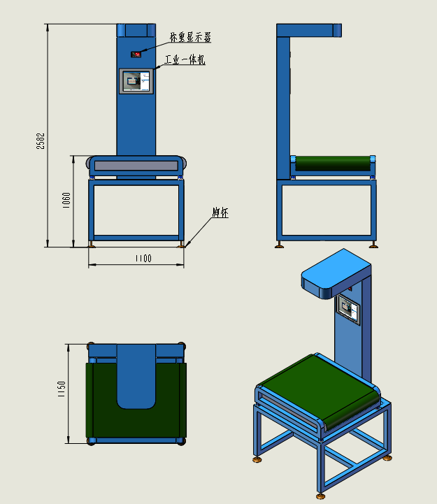 整機(jī)機(jī)架,烤漆或噴塑;測(cè)量模塊(測(cè)量鏡頭、數(shù)據(jù)線、軟件狗);稱重模塊(顯示儀表、稱重傳感器、數(shù)據(jù)線、電源適配器);掃碼槍